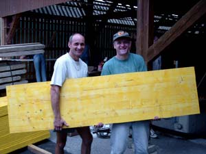 Auf unserem Foto schleppen Franz Krammer (links) und Holterbua Heinz Renhart eine von Hunderten Bodenplatten. Sie empfinden sichtlich Spaß an der Arbeit, was wohl auch eines der kleinen Geheimnisse fürs Musizieren ist und dass eine Gruppe über viele Jahre hindurch in unveränderter Besetzung spielt und zusammen hält.
